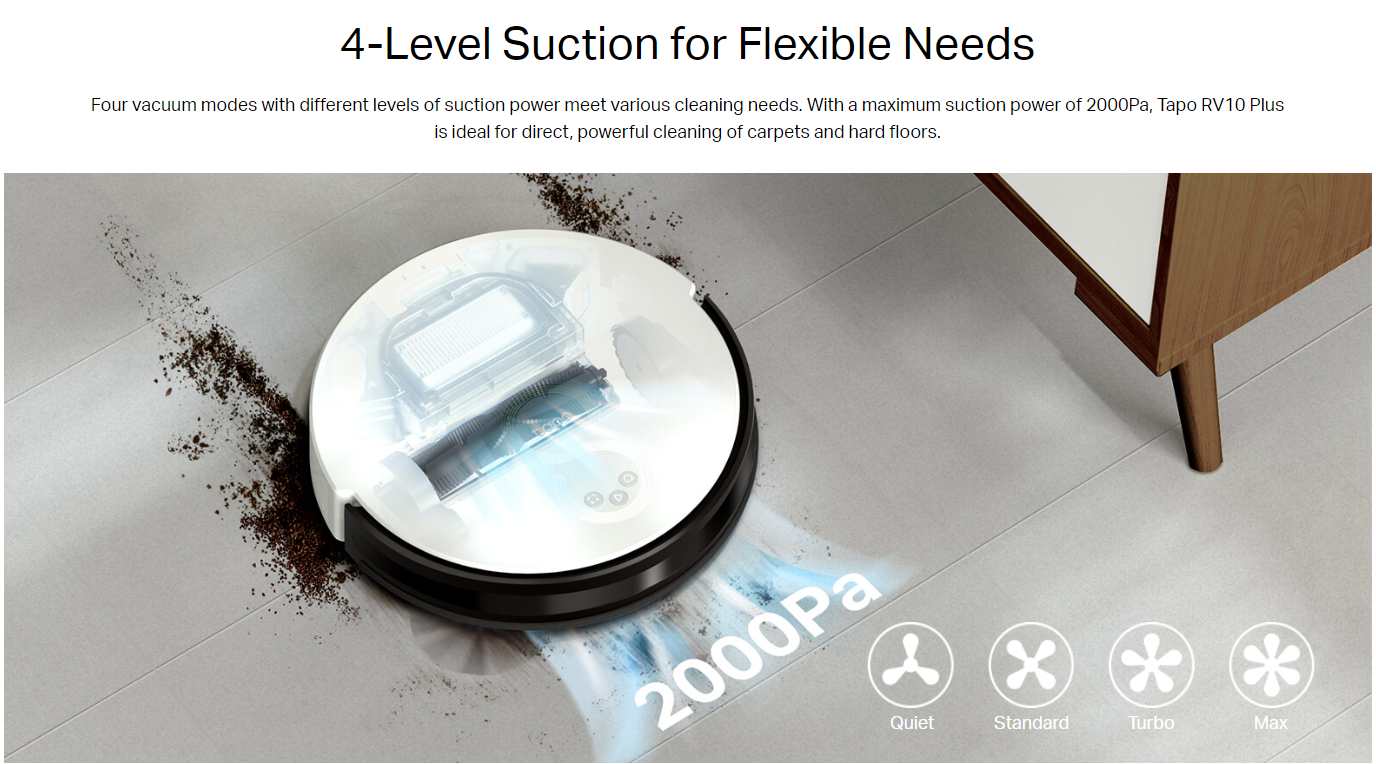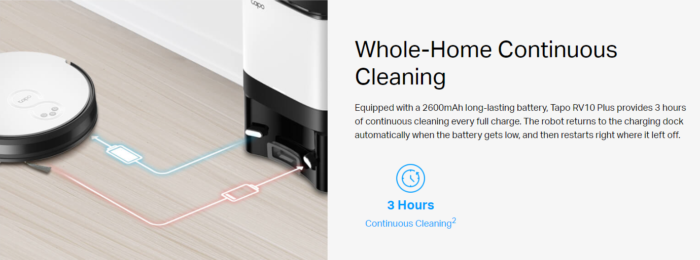 • 3-Hour Continuous Cleaning – TP-link Tapo RV10 Plus 2600mAh long-lasting battery to clean your whole home on a single charge.2