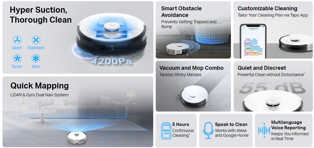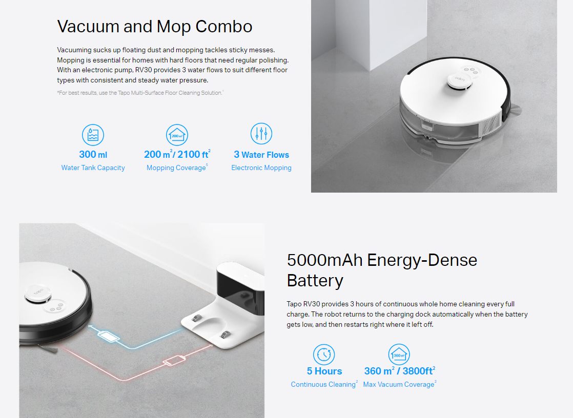 • 5-Hour Continuous Cleaning – TP-link TAPO RV30 5000 mAh battery for long-lasting, fade-free suction.2