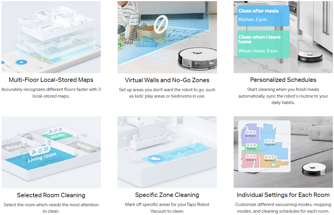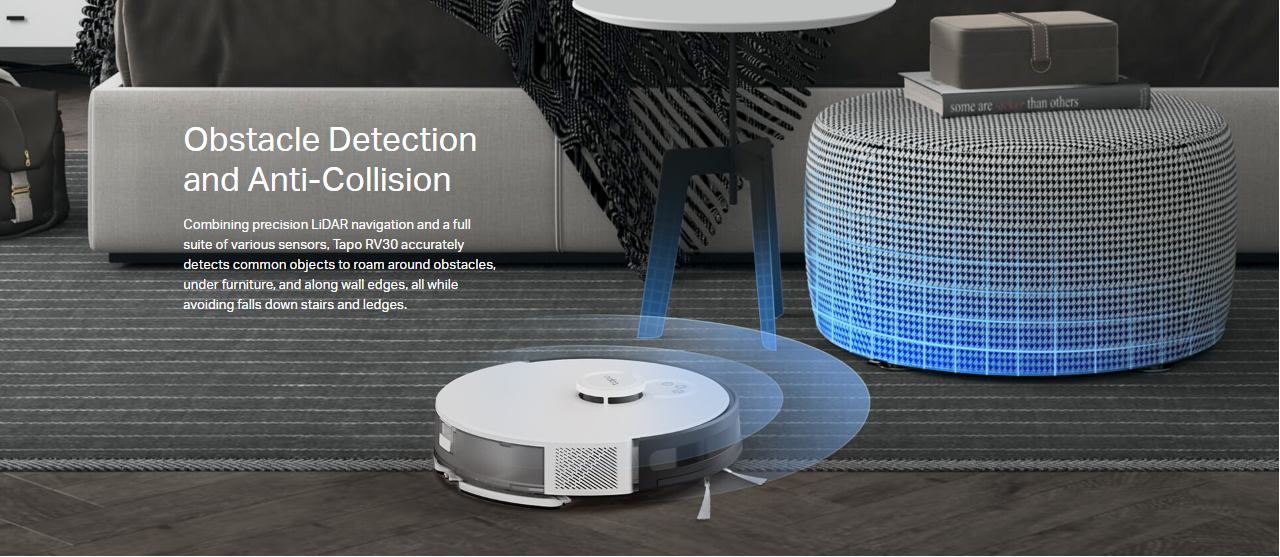 A LiDAR and Gyro dual navigation system in TP-link TAPO RV30 serves as the brain of the robot and accurately maps out your house in minutes, avoids omissions and repeated cleaning, and even works well in the dark.