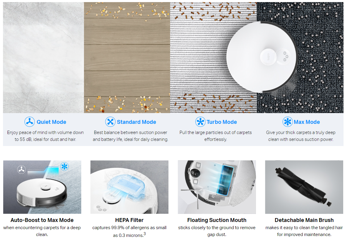 • 4200Pa Hyper Suction – TP-link TAPO RV30 sweeps away debris sandwiched between gaps and dust hidden in carpets for a deeper, powerful clean.
