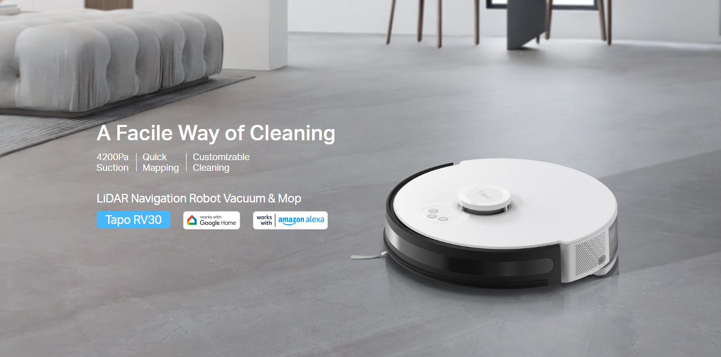TP-link TAPO RV30 robot vacuum offers 4200Pa suction, LiDAR and Gyro navigation, and a vacuum-mop combo for deep, efficient cleaning. With a 5000mAh battery, it provides 5 hours of continuous cleaning, auto-charging, and carpet auto-boost. Customize schedules, areas, and cleaning modes. Control via voice commands or the Tapo app, with real-time voice updates on its progress.