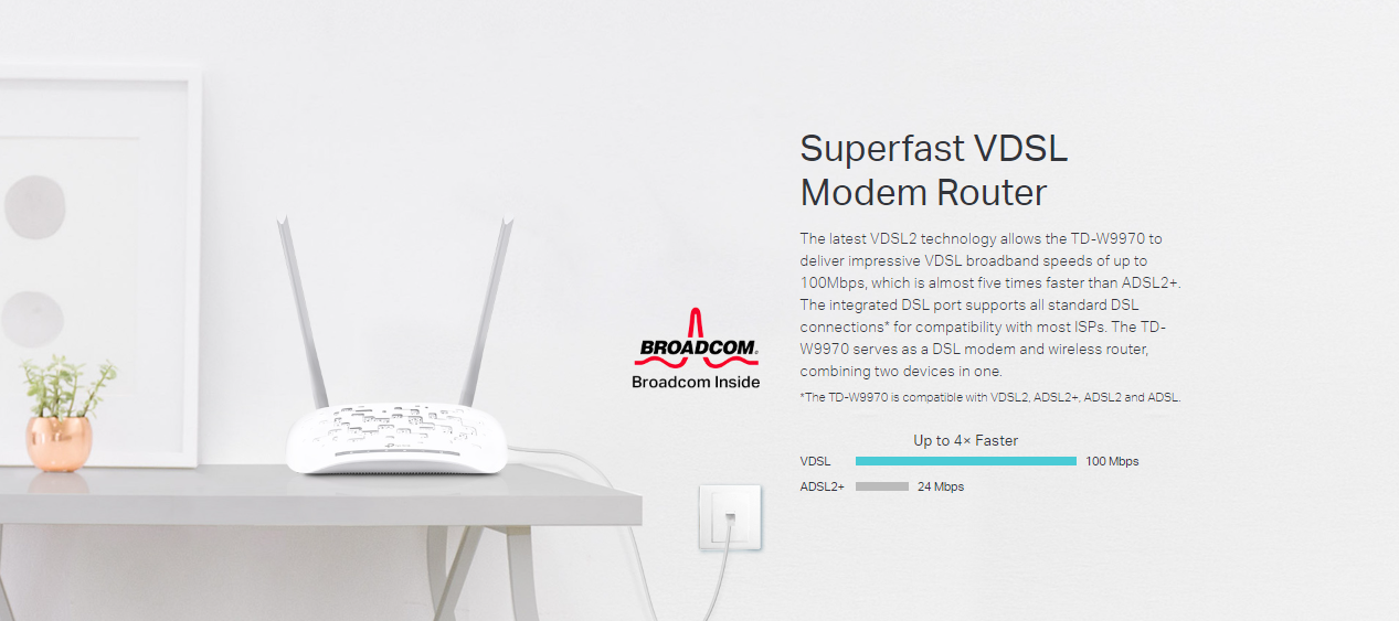 The TP-Link TD-W9970 is a versatile 300Mbps Wireless N VDSL/ADSL Modem Router, providing a complete networking solution for home or small business users. TP-Link TD-W9970 is Supporting VDSL2, ADSL2+, ADSL2, and ADSL, TP-Link TD-W9970 it also delivers high-speed internet access with seamless integration of a 4-port switch, wireless router, and USB sharing capabilities. TP-Link TD-W9970 router is ideal for a wide range of applications, including high-speed internet browsing, HD streaming, and gaming.