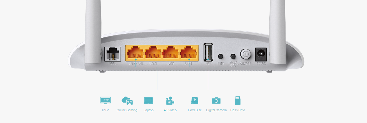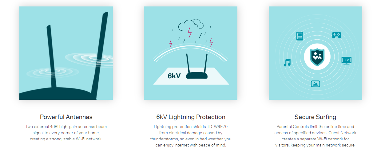 With 300 Mbps wireless speeds on the 2.4 GHz band and 4 megabit LAN ports, the TD-W9970 is perfect for streaming in HD, online gaming and other bandwidth-intensive applications.