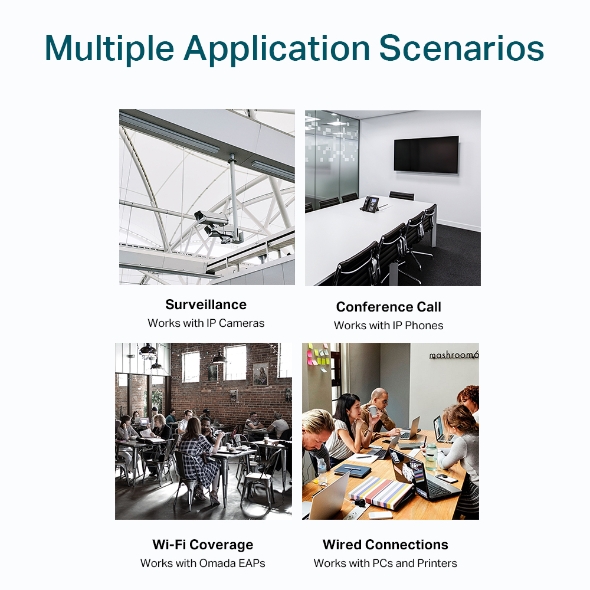 The TL-SG1218MP is fully compatible with PoE devices, such as IP cameras, access points, and IP phones. It also works with non-PoE wired devices to provide gigabit connections, such as PCs, printers, and IPTV.