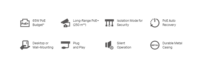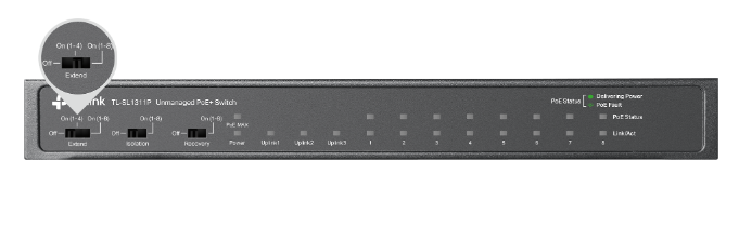 Advanced Functions• Compatible With IEEE 802.3af/at Compliant PDs • Extend Mode Button (Ports 1–4 and Ports 1–8, Up to 250 m PoE power supply and data transmission) • Isolation Mode Button (Ports 1–8) • PoE Auto Recovery Button (Ports 1–8) • Mac Address Auto-Learning and Auto-Aging • IEEE802.3x Flow Control For Full-Duplex Mode And Backpressure for Half-Duplex Mode
