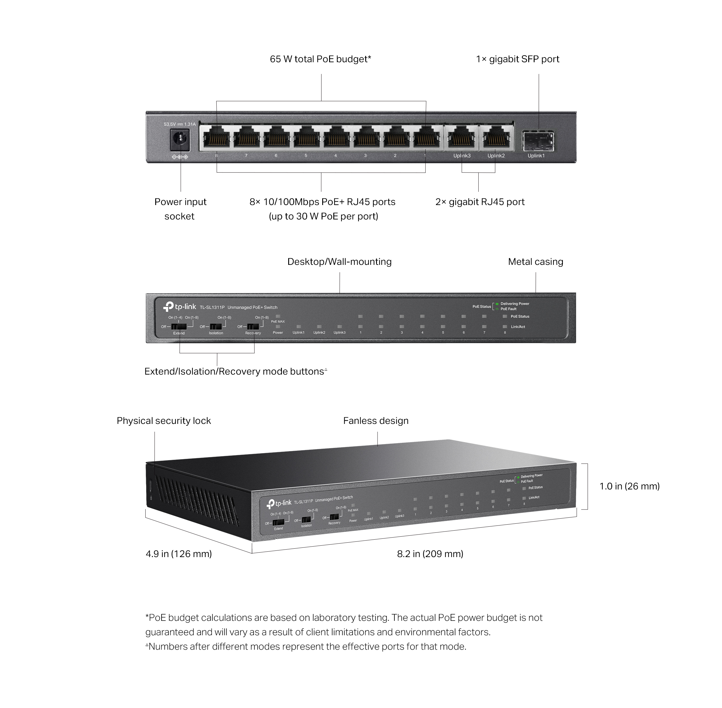 TP-Link TL-SL1311P switch features 8 PoE+ ports (65W total, 30W per port), 2 Gigabit ports, and 1 SFP port, with 250m transmission in Extend Mode, Isolation Mode for security, PoE Auto Recovery, and a silent, fanless, plug-and-play design.
