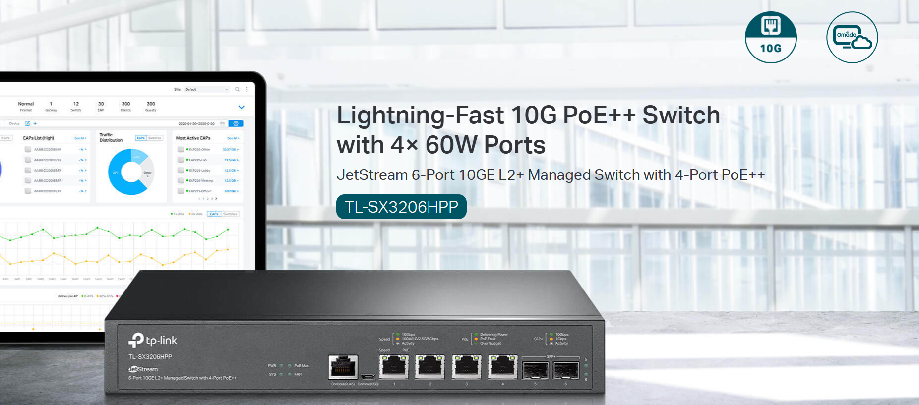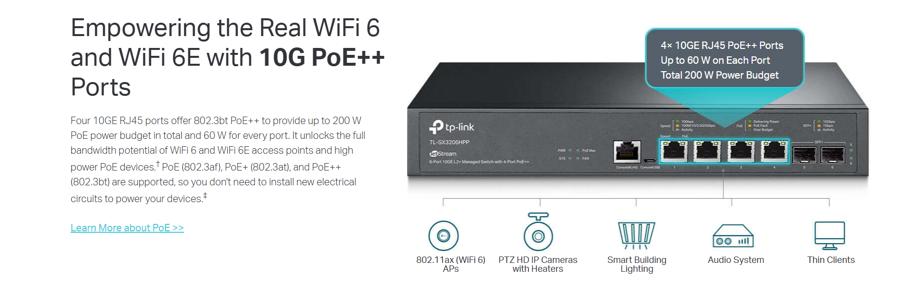 The TP-Link TL-SX3206HPP is a 6-port 10GE L2+ Managed Switch with 4 PoE++ ports (200W budget) and 2 SFP+ uplink ports, designed for high-performance enterprise networking with advanced features and Omada SDN support.
