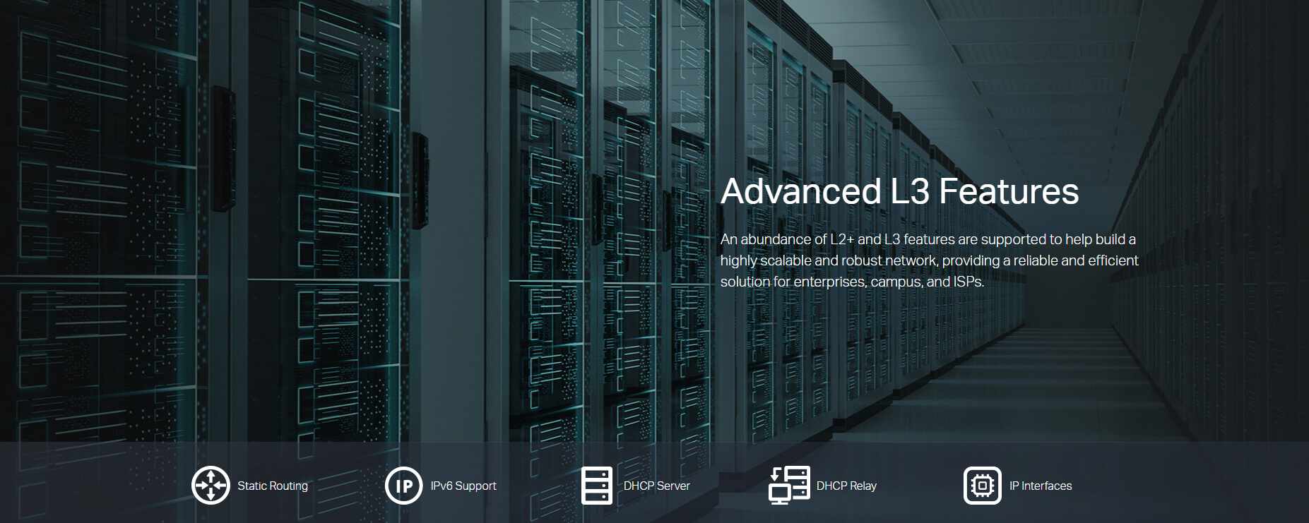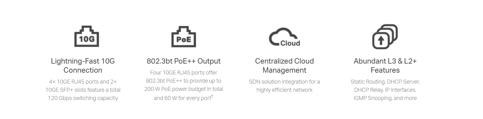 • Abundant L2 and L2+ Features: Supports a complete lineup of L2 and L2+ features, including Static Routing, enterprise-level QoS, and IGMP Snooping.