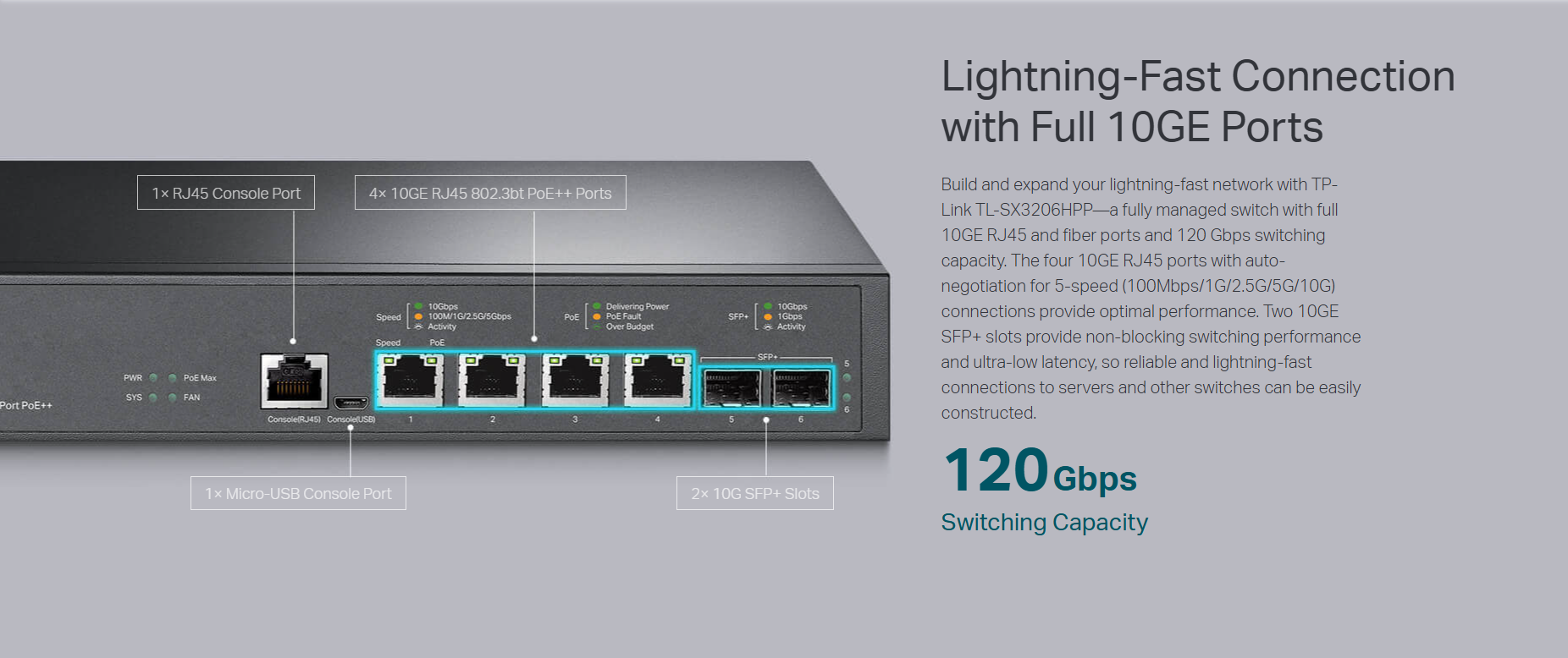 Interface• 4× 100/1000/2500/5000/10000 Mbps RJ45 Ports • 2× 10G SFP+ Slots • 1× RJ45 Console Port • 1× Micro-USB Console Port