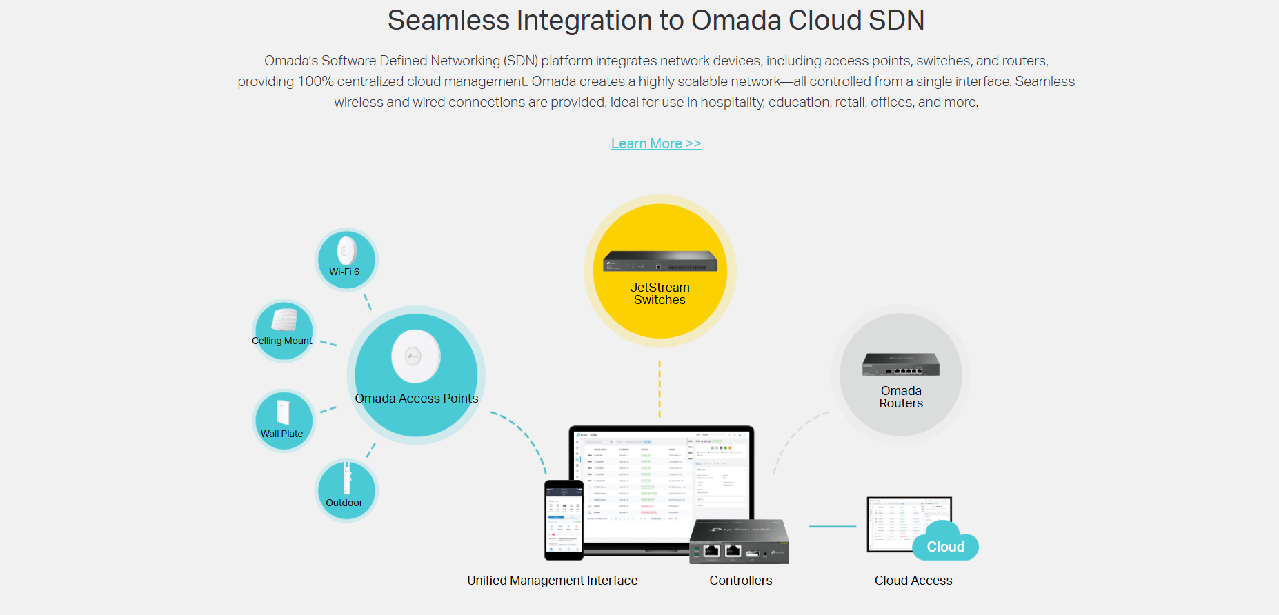 • Centralized Cloud Management: Integrates into Omada SDN for cloud access and remote management.