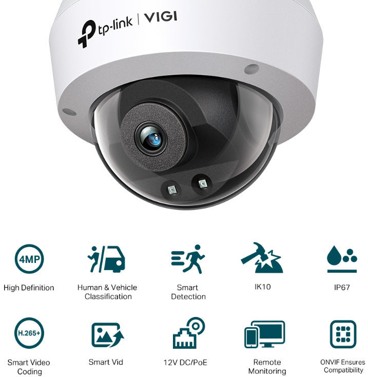 The VIGI C240I 4mm 4MP IR Dome Camera delivers high-definition imaging, smart detection, and alerts. It’s vandal-proof, waterproof, and uses H.265+ for efficient storage. Features like Smart IR, WDR, and Night Vision enhance video, with flexible setup and management options.