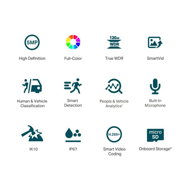 TP-Link VIGI C385 4K (8MP) Ultra HD outdoor camera offers 24-hour full-color surveillance with human and vehicle classification for accurate alerts. Equipped with smart detection, video enhancement technology, and H.265+ compression, it provides high-quality footage while saving storage. Active defense features, two-way audio, IP67 waterproofing, and flexible power options (12V DC/PoE) make it a reliable choice for robust, all-weather security monitoring.