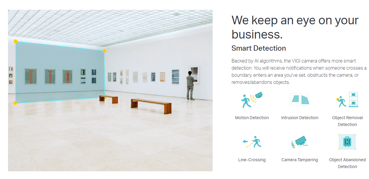 - Smart Detection: Receive notifications and check feeds when someone crosses a boundary, enters an area you’ve set, obstructs the camera, or removes/abandons objects.