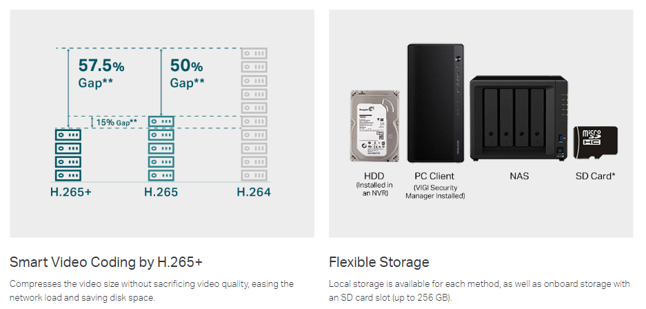 • H.265+: Without using any extra bandwidth, your cameras transmit compressed crystal-clear video to save disk space, ease network loads, and reduce monitoring costs without sacrificing image quality.