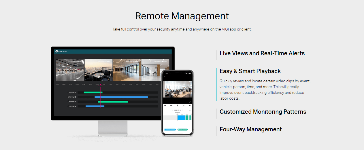 • Flexible Management and Storage: Take full control over your security via four management methods: the web UI, NVR UI, VIGI app, and VIGI Security Manager. Local storage is available for each method, as well as onboard storage with SD card slot (up to 256 GB).