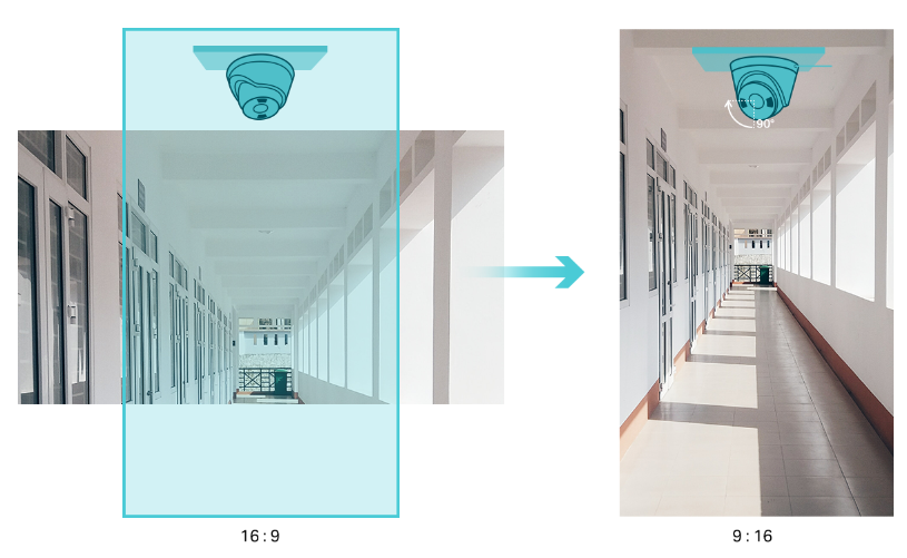 Rotate the live image and lens 90° clockwise simultaneously. This way, your image aspect ratio changes from 16:9 to 9:16, helping you monitor long and narrow areas and providing a more natural viewing experience.