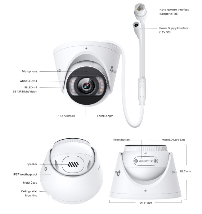 The TP-Link VIGI C485  4K (8MP) camera offers 24/7 full-color video with human and vehicle classification, smart detection, and Smart Video Enhancement for clear footage. It features active defense with sound/light alerts, two-way audio, and is IP67 waterproof. H.265+ compression optimizes storage, and it supports both 12V DC and PoE for flexible power options.