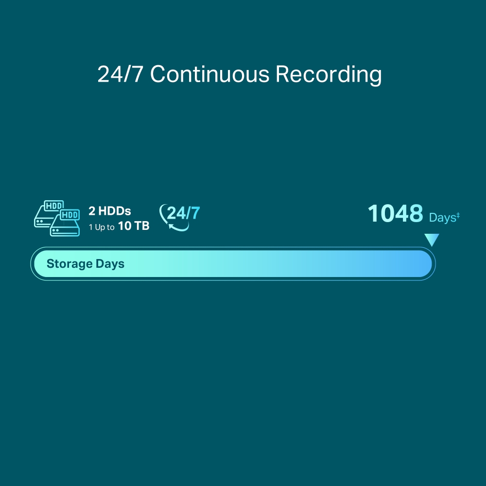 • 24/7 Continuous Recording: Stores up to 20 TB of footage (1048 storage days‡) from connected cameras to secure your data for quick, convenient access.