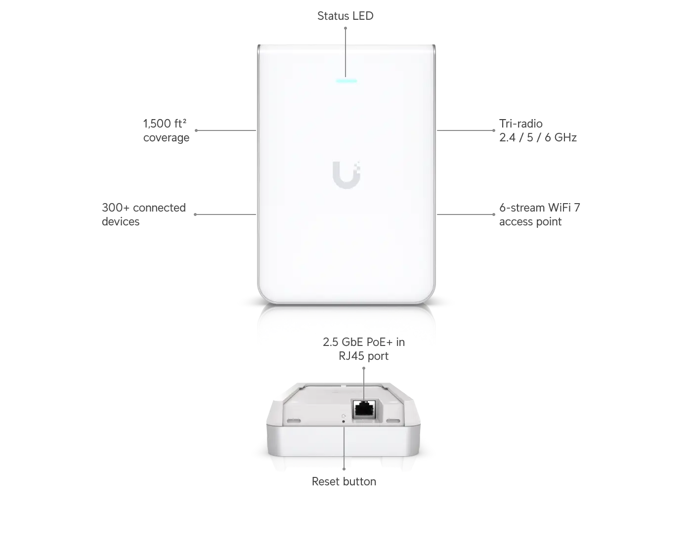 Ideal for hospitality, MDU, and enterprise deployments, the U7 Pro Wall ensures consistent and secure wireless experiences for all connected clients. Whether you’re expanding your current UniFi setup or deploying new infrastructure, this AP delivers the speed, reliability, and scalability you need or the perfect blend of performance and convenience in a sleek wall-mount form factor.