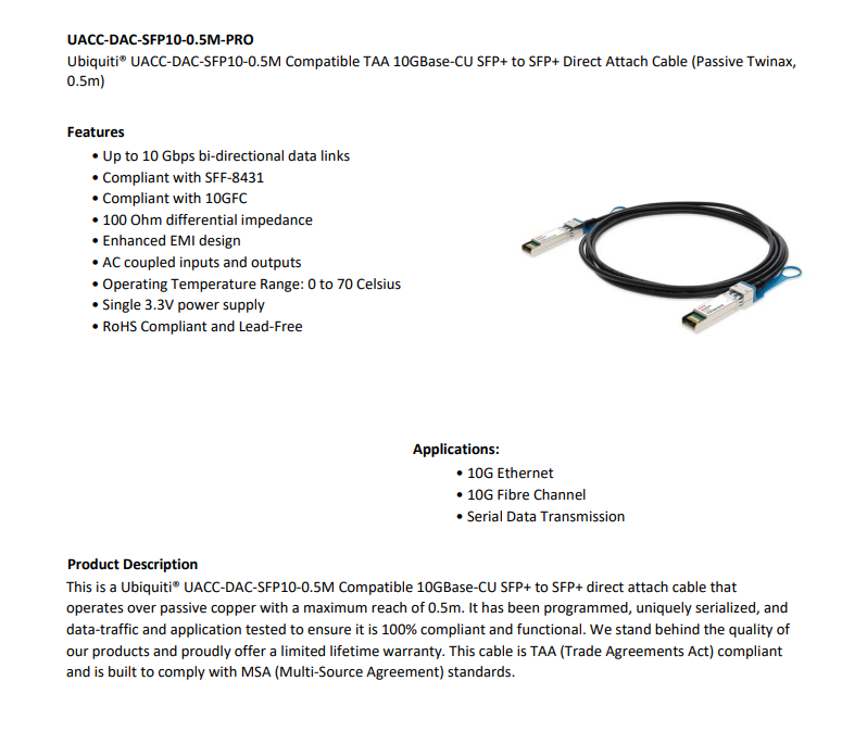 Ubiquiti UACC-DAC-SFP10-0.5M is Designed for easy installation, the Ubiquiti UACC DAC SFP10 cable features hot-swappable connectors, which allows users to simply plug the cable into compatible devices without the need for additional configuration or software. Its low-power consumption and cost-effective solution make it a suitable choice for anyone needing high-speed connectivity in enterprise networks or data center environments.