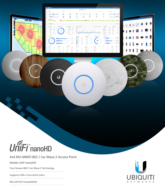 Ubiquiti UAP-nanoHD compact, ceiling-mounted WiFi 5 AP with 6 spatial streams ideal for smaller offices.