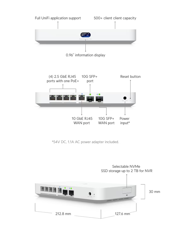Ubiquiti UCG-Fiber is equipped with a quad-core ARM Cortex-A73 processor, 3GB RAM, and optional NVMe SSD storage (up to 2TB), it functions as a network video recorder (NVR) for UniFi Protect cameras, handling up to 15 HD, 8 2K, or 5 4K cameras. The 30W PoE budget allows direct power delivery to PoE-enabled devices.