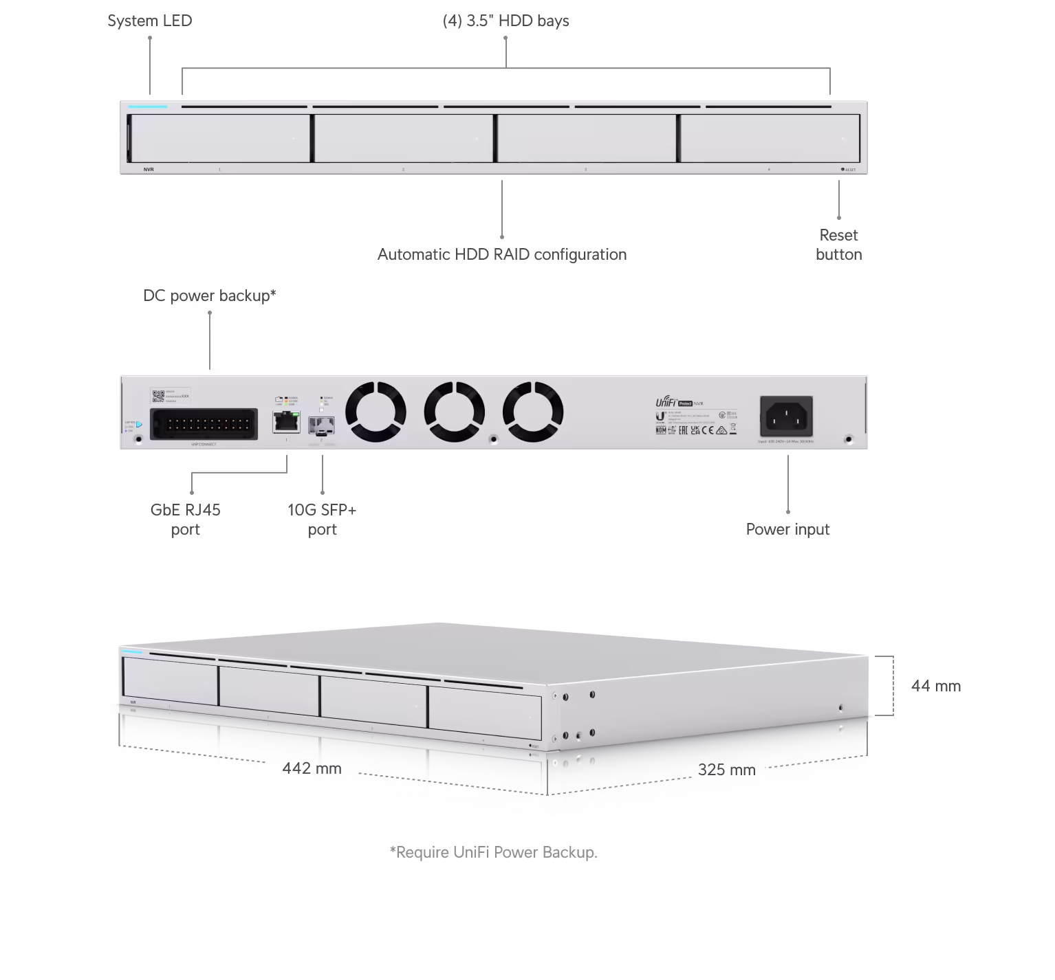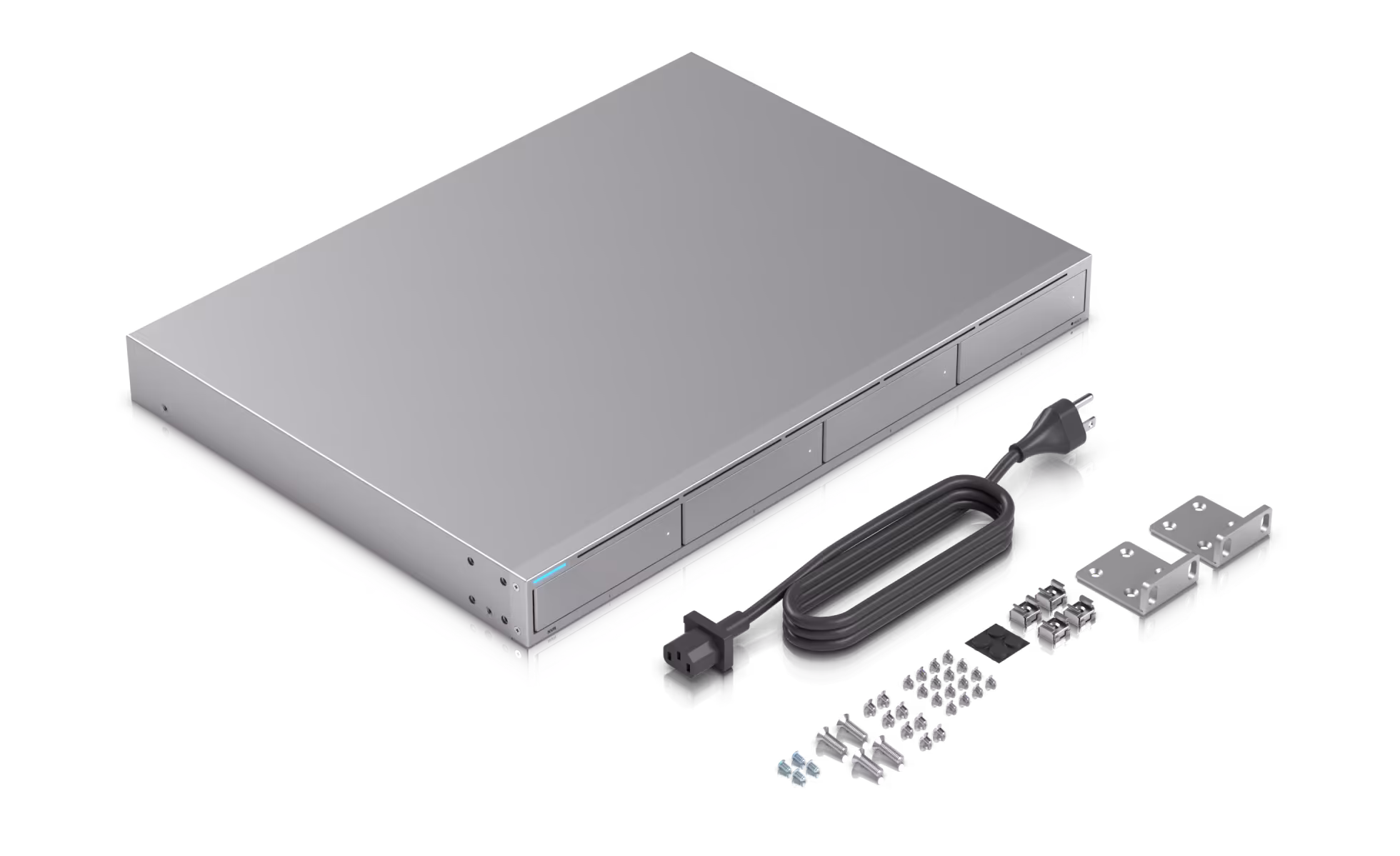 Ubiquiti UNVR Unifi Network Video Recoder with (4) 2.5/3.5″ HDD bays that can support up to 30 days of storage for (18) 4K cameras or (60) Full HD cameras.