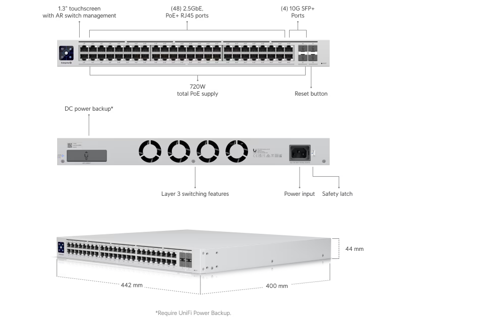 Ubiquiti USW-Enterprise-48-POE comes With 2.5 GbE ports, the USW-Enterprise-48-POE provides faster data throughput than standard Gigabit switches, supporting high-bandwidth applications like video conferencing, file sharing, and high-speed server connections. The switch is equipped with advanced Layer 3 features, including VLAN, static routing, and inter-VLAN routing, which provide superior network management and traffic segmentation for optimized performance.