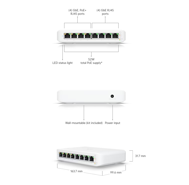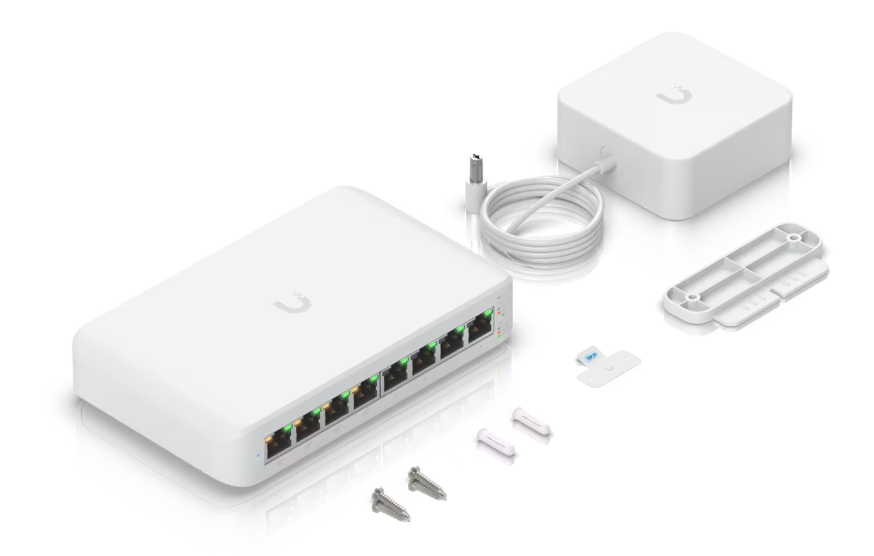 | USW-FLEX | PoE Switch | Compact, outdoor-rated PoE switch for flexible deployments | 5-port GbE, PoE passthrough, Weather-resistant design |