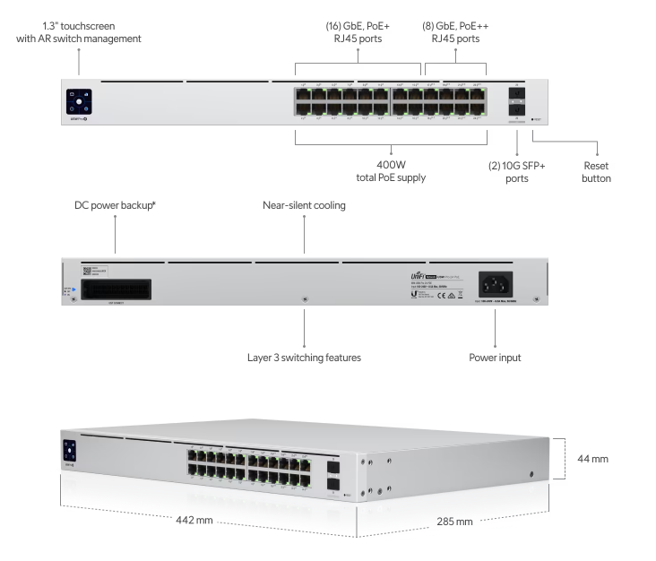 Ubiquiti USW-Pro-24-POE 24-port, Layer 3 switch (16) GbE PoE+, (8) GbE PoE++ ports (2) 10G SFP+ ports | 400W total PoE availability | DC power backup-ready | Near-silent cooling