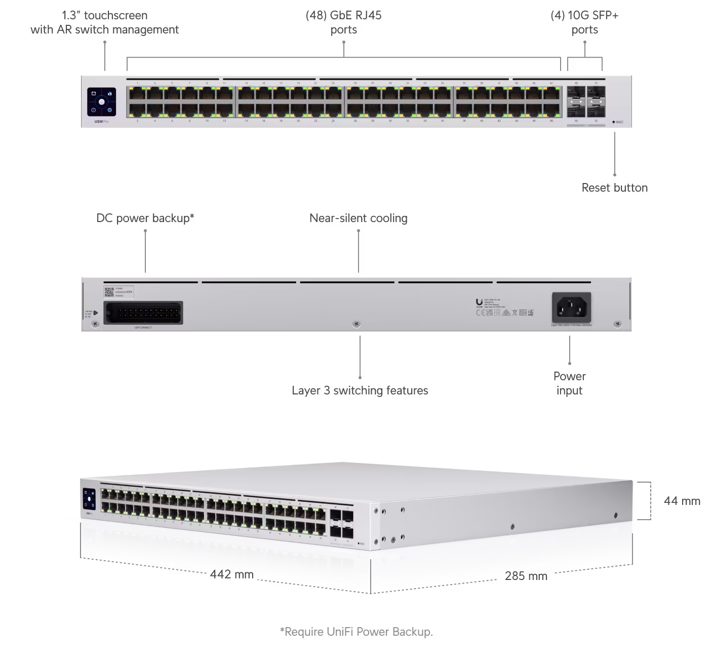 Ubiquiti USW-Pro-48 48-port (48G, 4 SFP+) Layer 3 switch supporting 10G SFP+ connections with fanless cooling and 1.3′ touchscreen| UniFi Switch Pro 48