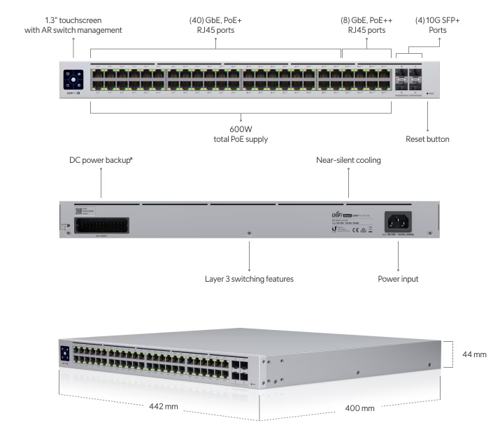 Ubiquiti USW-Pro-48-POE A 48-port, Layer 3 switch (40) GbE PoE+, (8) GbE PoE++ ports (4) 10G SFP+ ports | 600W total PoE availability | DC power backup-ready| Near-silent cooling