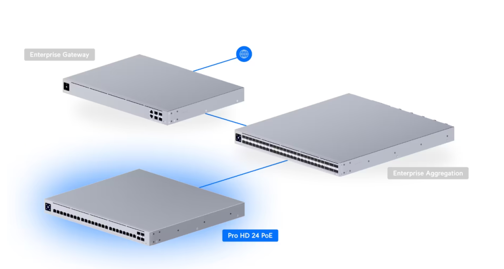 Ubiquiti USW-Pro-HD-24-PoE switch is fully Layer 3 capable, supporting DHCP server, inter-VLAN routing, and static routing, allowing for efficient traffic management in complex networks. Security features such as 802.1X authentication, MAC-based ACLs, DHCP snooping, and port isolation provide robust access control and protection.