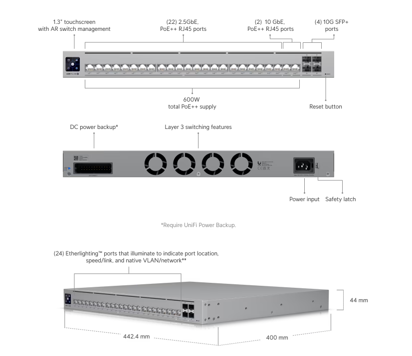 Ubiquiti USW-Pro-HD-24-PoE comes with a 600W PoE budget, the Ubiquiti USW-Pro-HD-24-PoE supports power-hungry devices while maintaining stability. Etherlighting™ technology enhances network monitoring and troubleshooting by visually indicating port activity, VLAN assignments, and link status.
