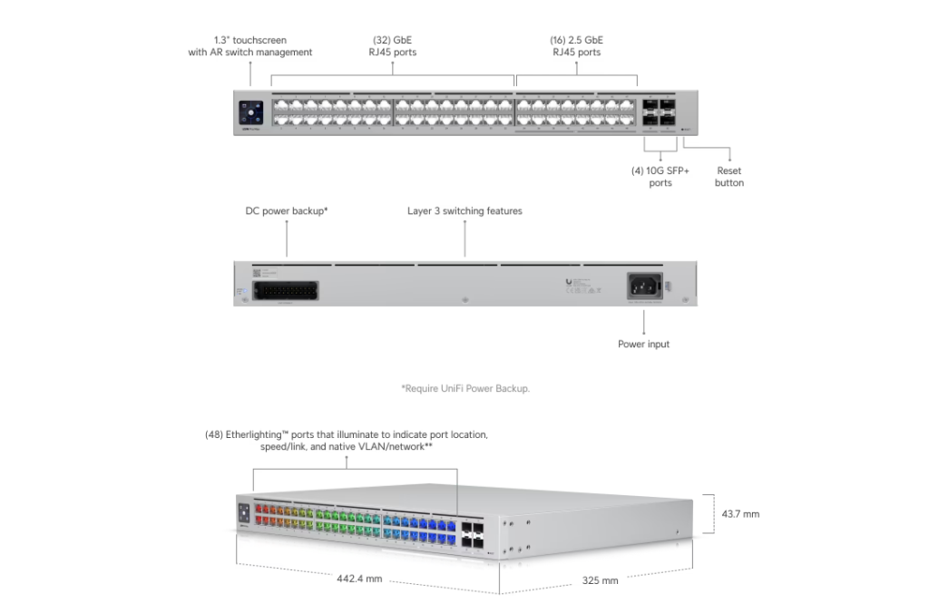 The Ubiquiti USW-Pro-Max-48 is a high-performance Layer 3 switch with 32 × 1GbE, 16 × 2.5GbE, and 4 × 10G SFP+ ports, designed for enterprise, Wi-Fi 6/6E networks, and high-speed AV applications. With 224 Gbps switching capacity, Etherlighting™ technology, and advanced Layer 3 features, it’s an ideal choice for scalable, high-bandwidth networking.