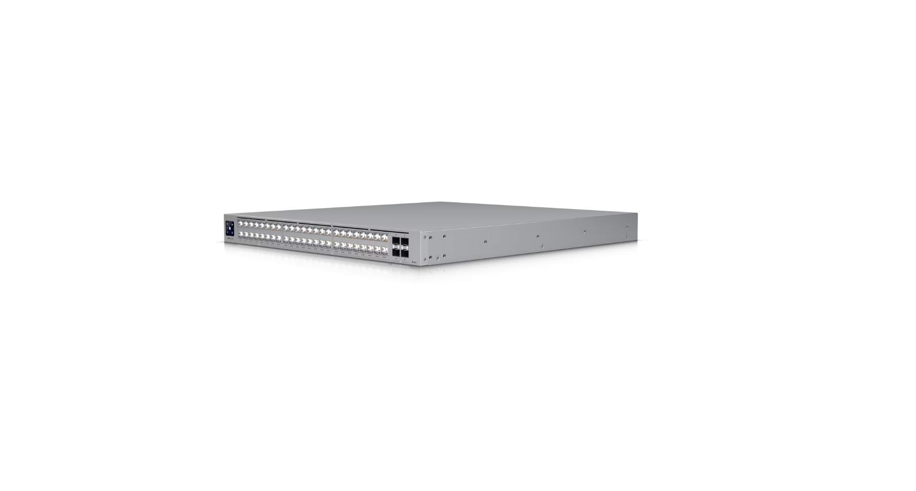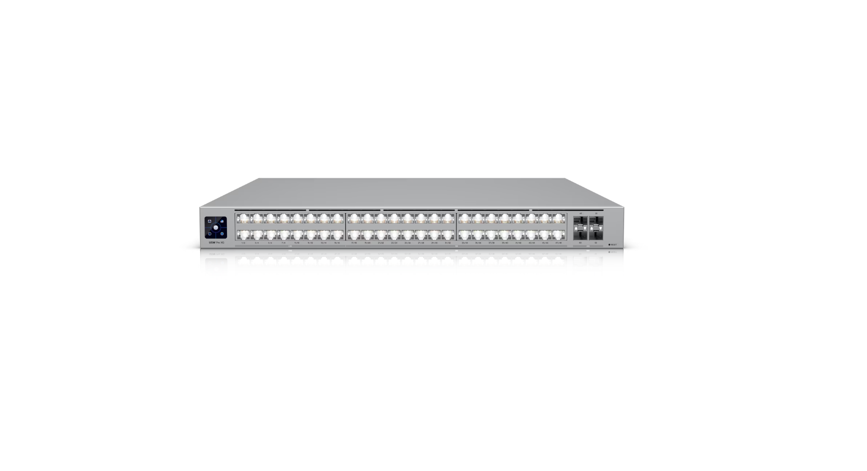 Ubiquiti USW-Pro-XG-48 switch also integrates Etherlighting™ technology, offering real-time visual network diagnostics through LED indicators, and a 1.3” LCM touchscreen for on-device monitoring and management. Robust Layer 2 features such as LACP, STP/RSTP, QoS, IGMP Snooping, 802.1X, ACLs, DHCP Guarding, and loop protection ensure superior control, security, and uptime.