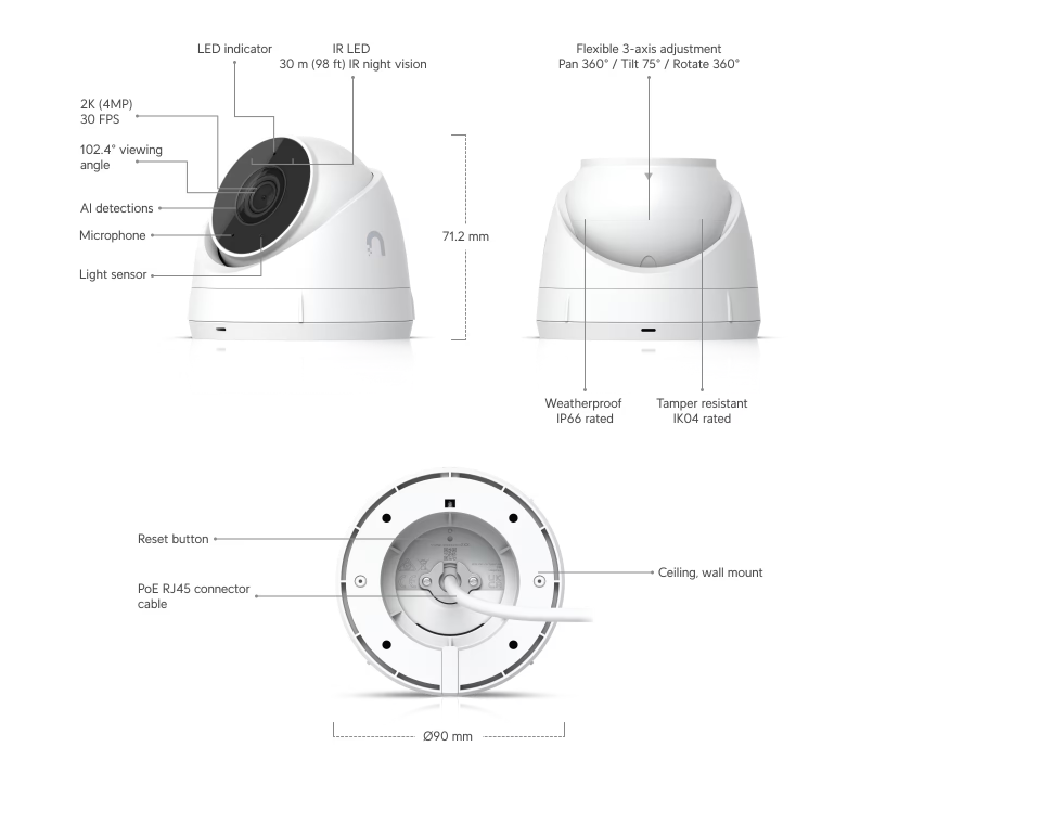 • UVC-G5-Dome – 4MP (2K) compact indoor/outdoor dome camera with IR night vision and AI motion detection.
