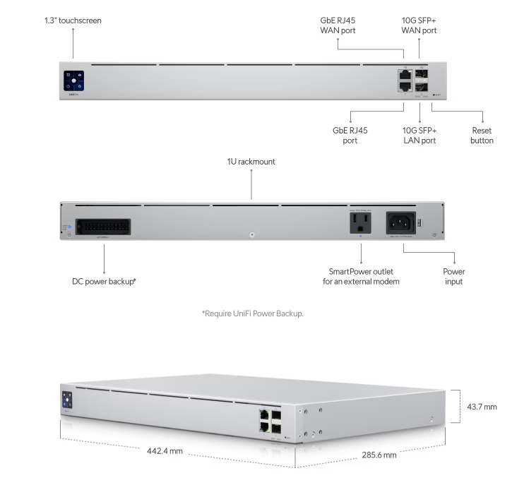 10G multi-WAN independent gateway with UniFi Power Backup support designed to protect large-scale networks.