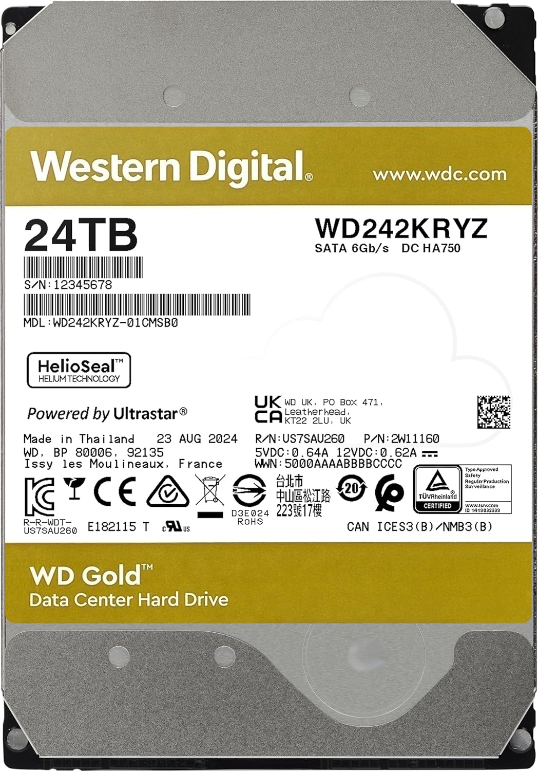The Western Digital WD Gold 24TB | WD242KRYZ is a high-performance, enterprise-class 3.5-inch SATA HDD designed for demanding data environments where durability and reliability are crucial. WD Gold 24TB | WD242KRYZ model features Helium-sealed technology and OptiNAND integration, ensuring enhanced efficiency and optimal use of its massive 24TB capacity. The WD Gold 24TB | WD242KRYZÂ is engineered to handle extreme read-write workloads up to 550TB per year, making WD Gold 24TB | WD242KRYZ ideal for mission-critical commercial systems, hybrid clouds, and complex storage arrays like RAID and JBODs. With ArmorCache for superior power loss protection and a robust rotational vibration safeguard system, this hard drive maintains peak performance even in high-vibration environments.